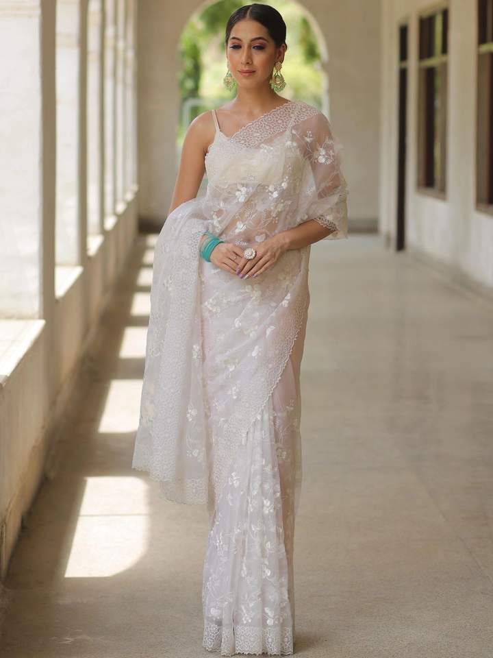 El último diseñador Soft Organza Silk Thread Work Saree de Fab Zone