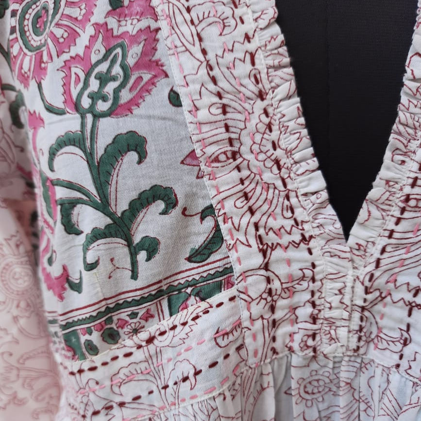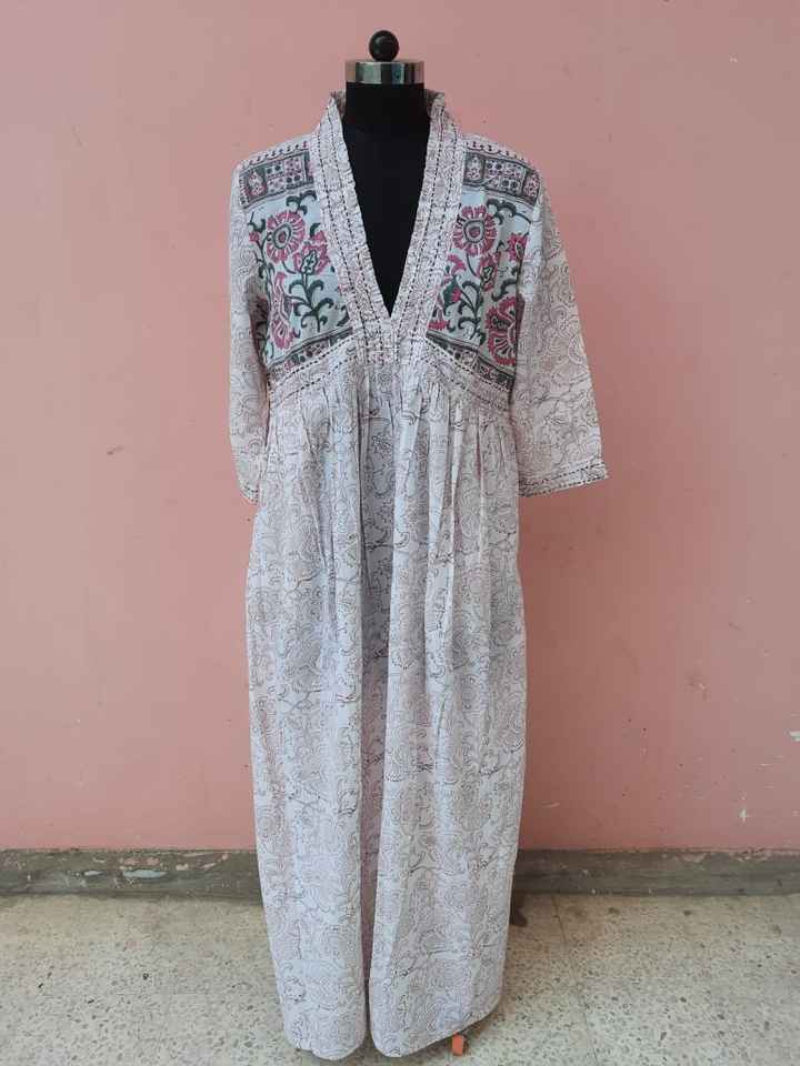 Vestido de tela estampado de bloque de mano de algodón de alta calidad con cuello en V diseño bordado bolsillo Maxi vestido estándar Festival ropa de mujer