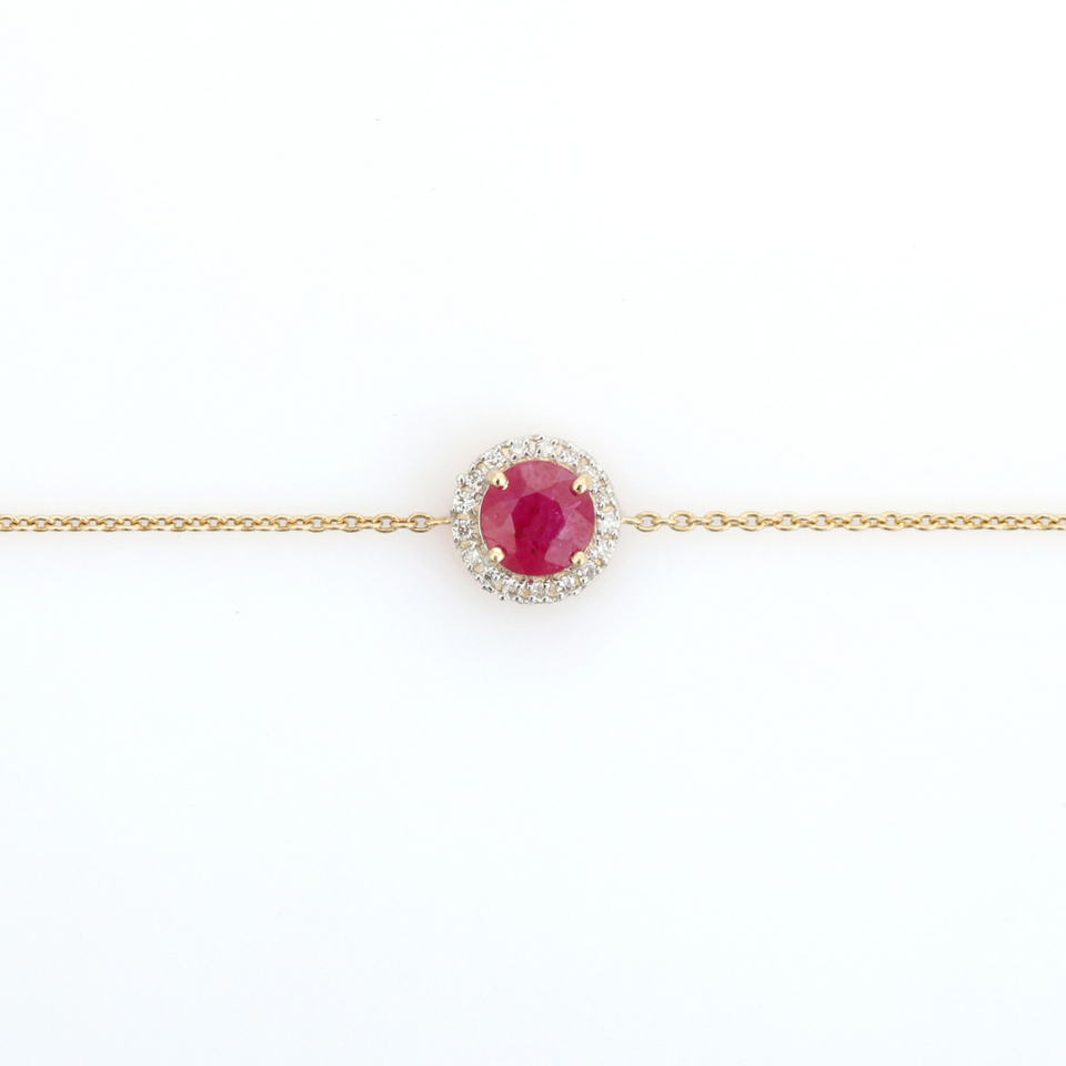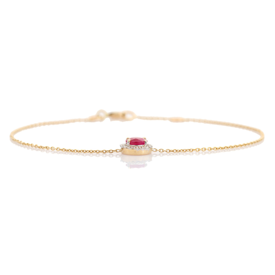 Pulsera de cadena con halo de una sola piedra de rubí y diamantes con diseño elegante y moderno, en oro amarillo de 14 quilates, para mujer, joyería hecha a medida.