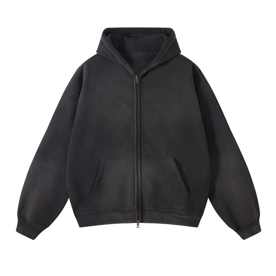 Sudadera con capucha térmica con cremallera y bolsillo de canguro de tela transpirable pesada lavada con ácido personalizada de última moda