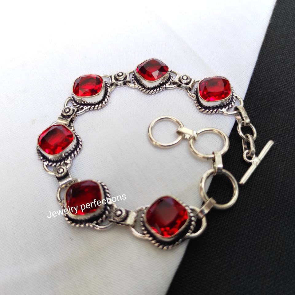 Pulsera de eslabones de cadena ajustable chapada en plata para mujer, ajuste de garra de corte de cristal facetado granate rojo, joyería de moda