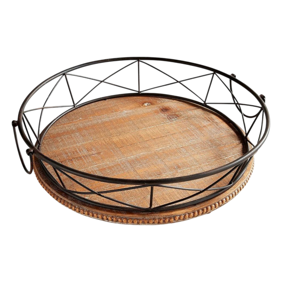 Cesta de madera redonda de diseño moderno con asa de metal para regalo, para vajilla, para centro de mesa.