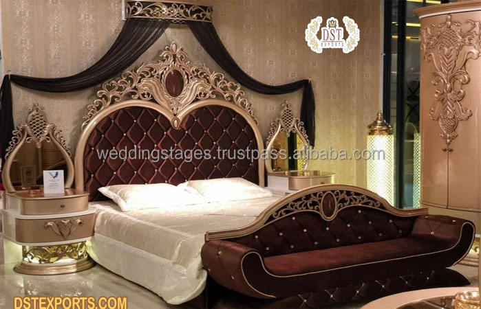 Cama de estilo moderno con acabado dorado y mesita de noche, mueble de dormitorio esponjoso de diseño, nuevo estilo moderno