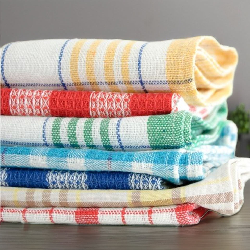 10 piezas en bolsa de polietileno 100 piezas por caja. Puede seguir su requisito para toallas de cocina de algodón liso. NOTA: las piezas en cartones dependen de la toalla de cocina GSM/peso/tamaño.