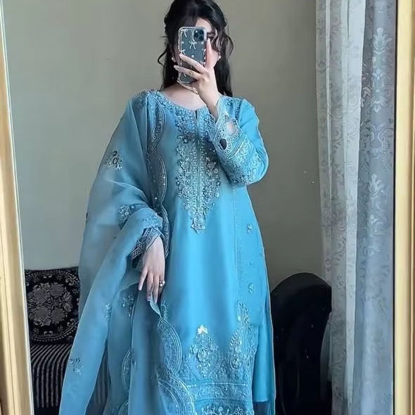 Salwar Kameez Moderno Pakistaní de Fiesta, en Georgette Pesado con Bordado de Hilo Múltiple, Jari y Lentejuelas para Mujer