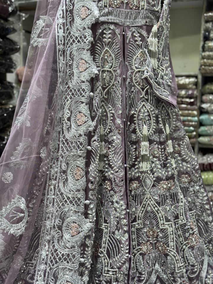 Vestido Maxi de Novia Pakistaní de Última Moda, Tela de Red con Pedrería de Espejo, Trabajo de Lentejuelas y Dupatta a Juego con Trabajo de Calado