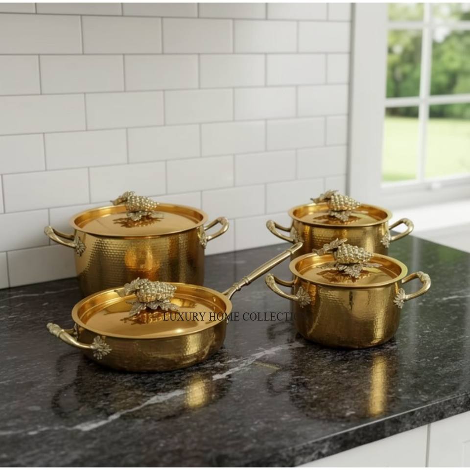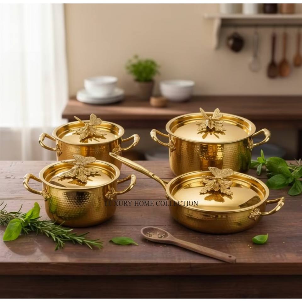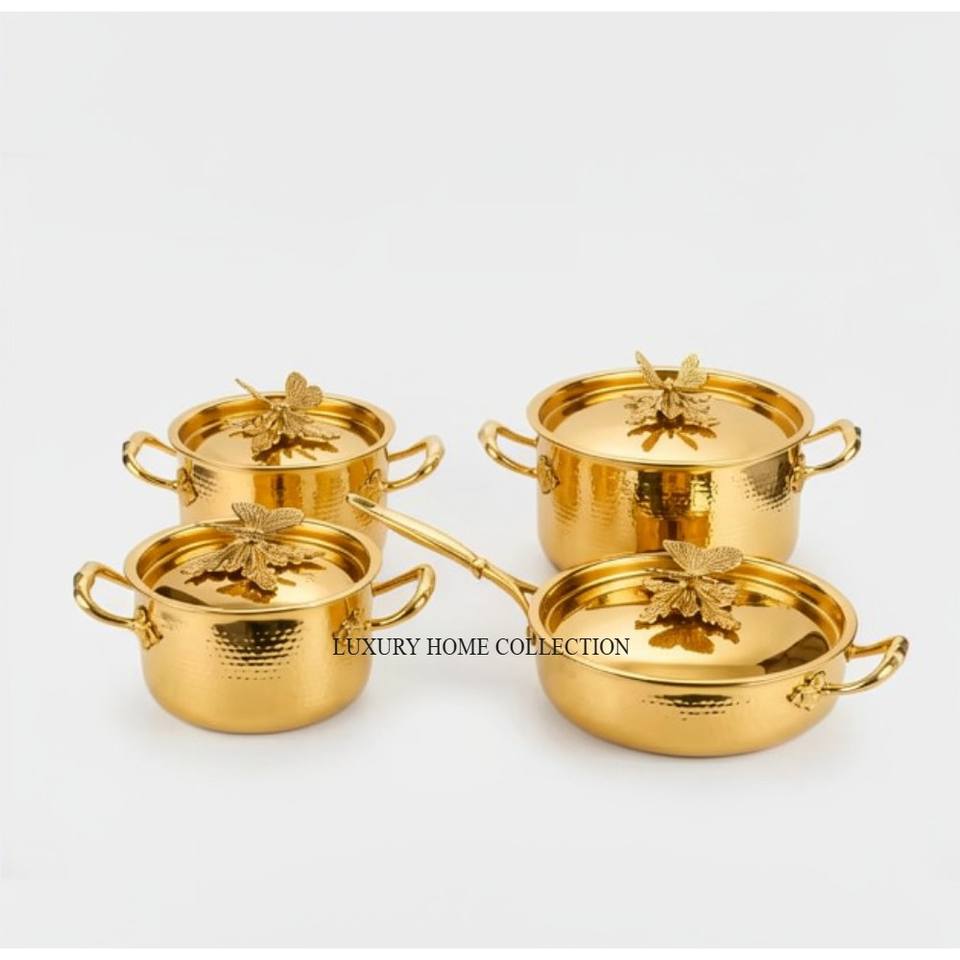 Última Llegada de Patrones Modernos, Cacerolas de Lujo de Acero Inoxidable de Alta Calidad con Textura Martillada y Baño de Oro a un Precio Impresionante