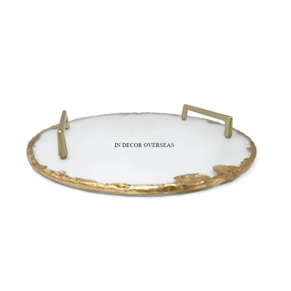 Bandeja de servicio de forma redonda hecha de mármol de calidad Superior con asas de diseño elegante de Metal chapado en oro
