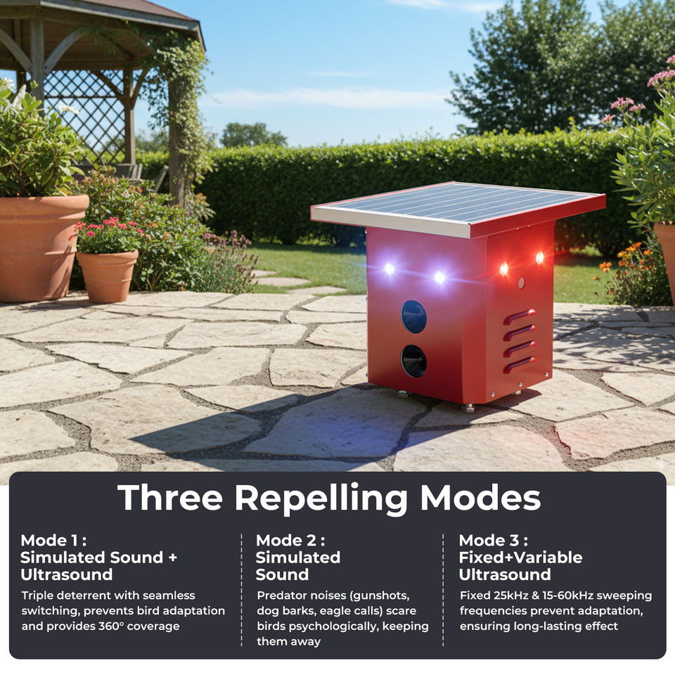 Potente Ahuyentador de Aves Ultrasónico Solar con Sensor de Movimiento y Control Remoto para Jardín, Huerto y Granja