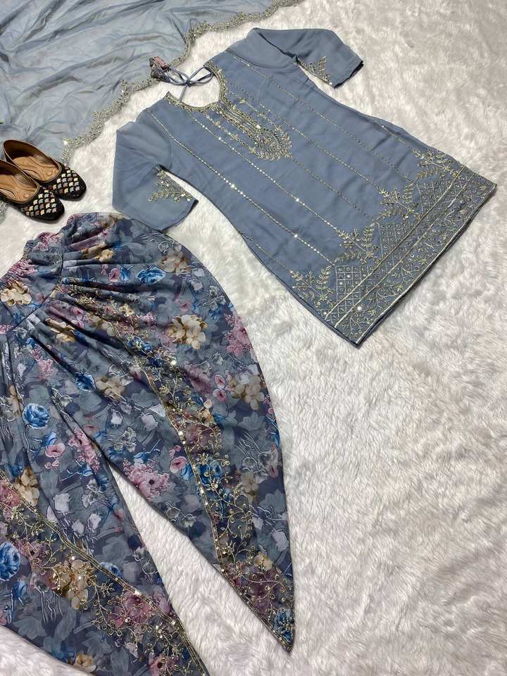 Lanzamiento de nuevo diseñador Party Wear Look Top Dhoti Salwar y Dupatta Faux Georgette con trabajo de secuencia de bordado pesado