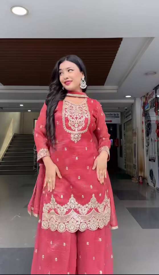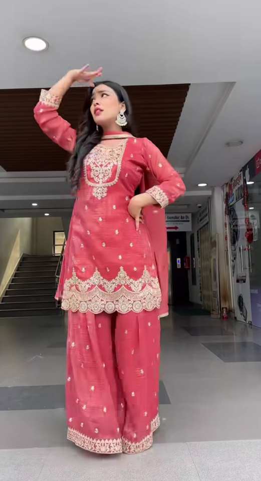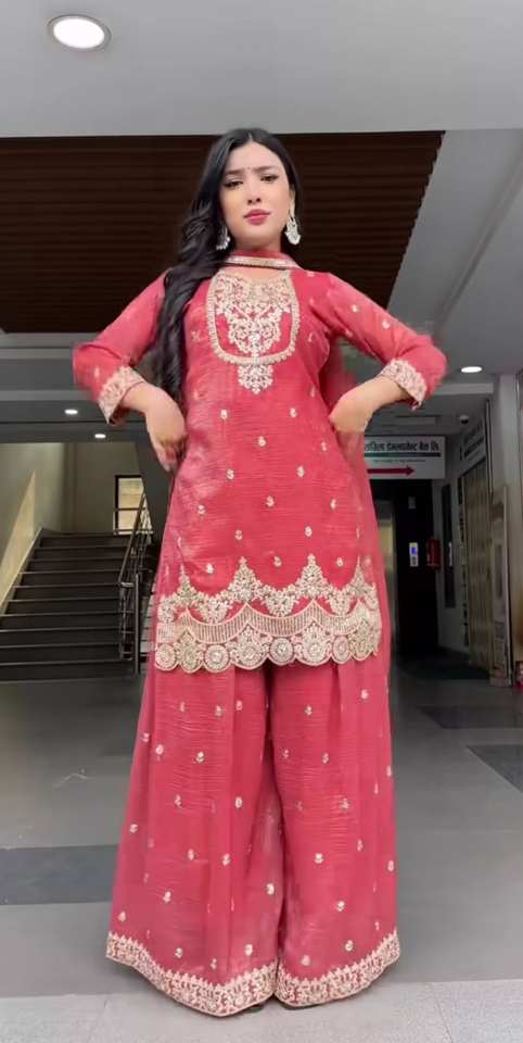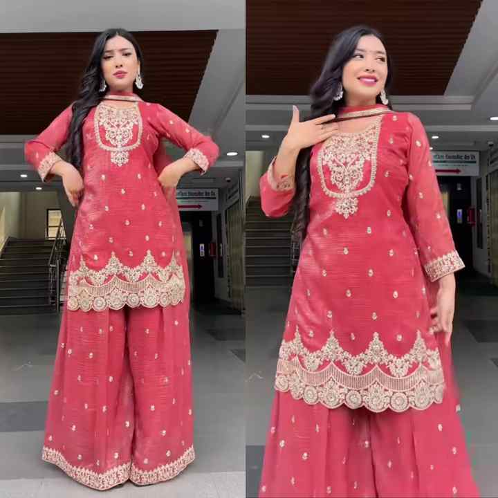 Lanzamiento de un nuevo conjunto de fiesta de diseño: top, sharara, plazzo y dupatta. <Nuevo estilo elegante>