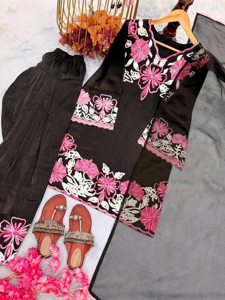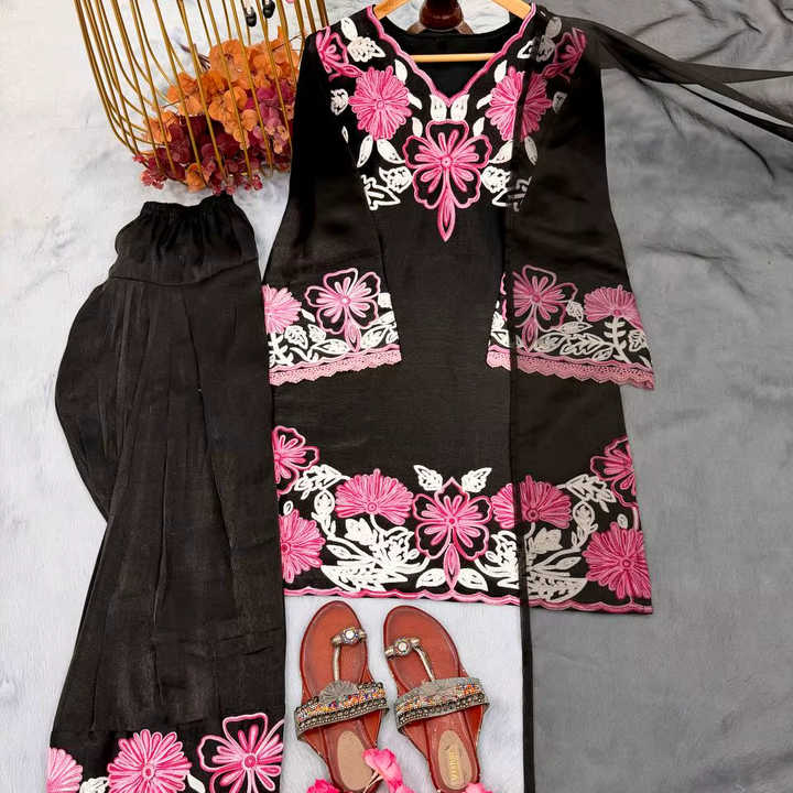 Lanzamiento del nuevo conjunto de fiesta de diseñador con top de satén Pur Glass y pantalones Farshi Palazzo con dupatta.
