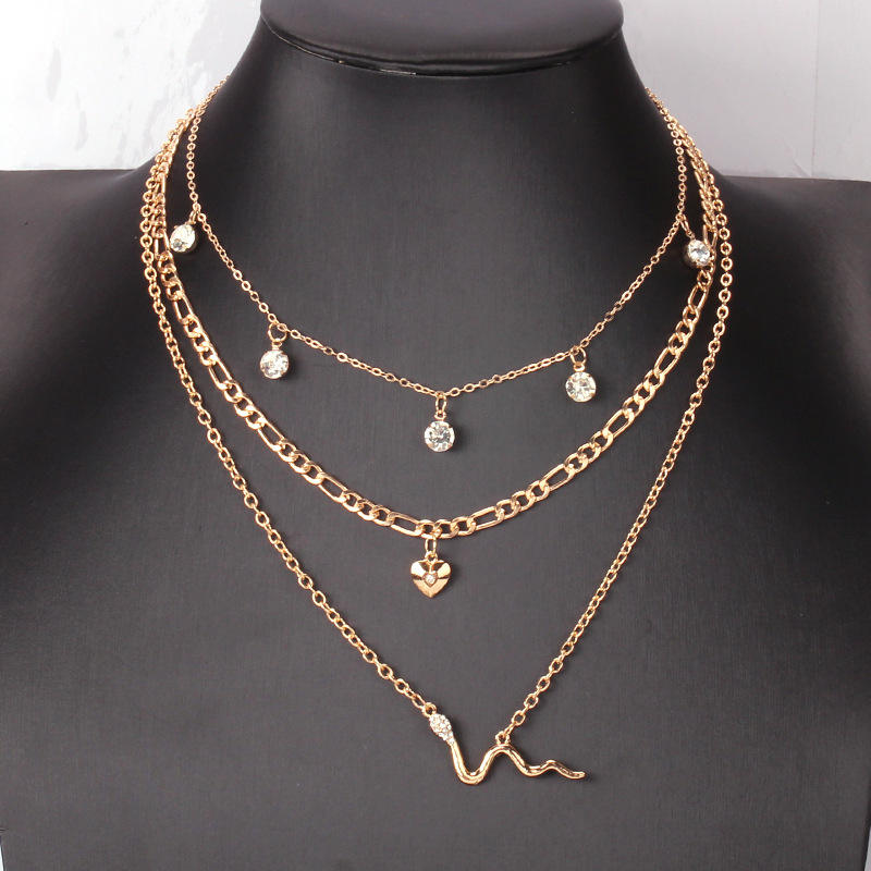 Collar de Serpiente en Capas con Corazón Dorado y Diamantes de Imitación, Joyería de Moda para Fiesta con Múltiples Cadenas