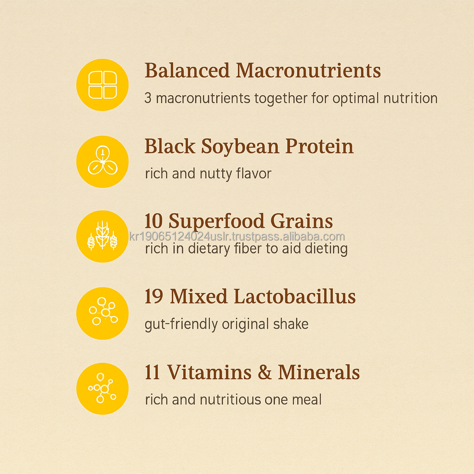 Ingrediente principal:Mezcla de leche descremada en polvo, Polvo de garbanzo, Polvo del aislado de la proteína de suero, Polvo asado de la soja, Mezcla de 19 probióticos mixtos.
