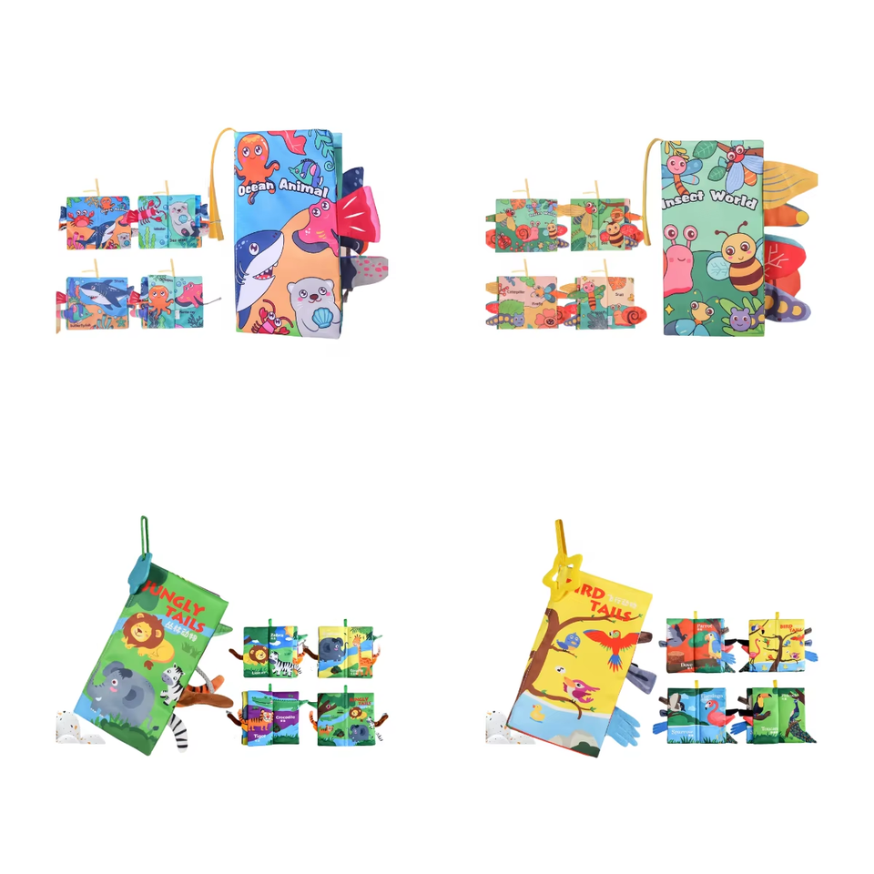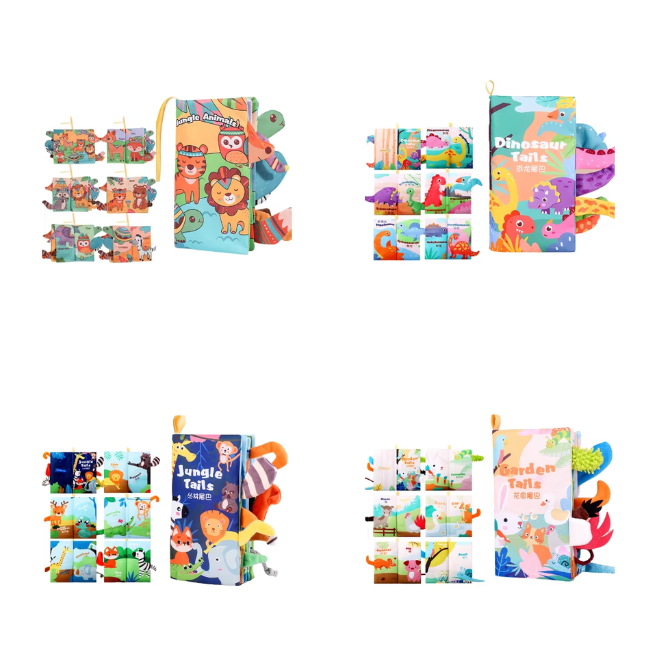 Juguetes de aprendizaje temprano: Sonajeros táctiles, libros de tela suave con cola de animal 3D y efecto crinkle para bebés.