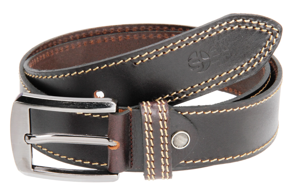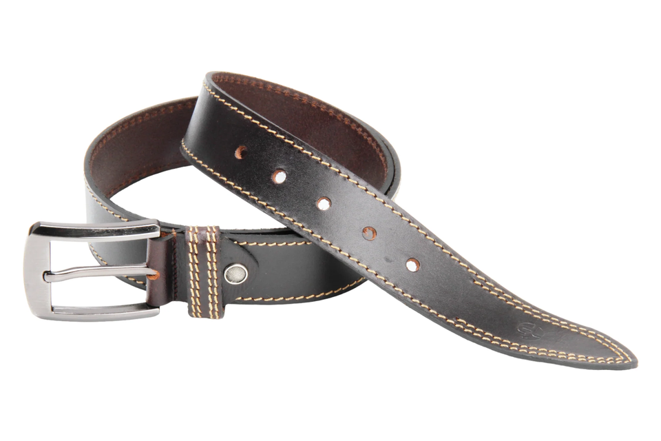 Correa de Cuero Genuino para Hombre, Negra, con Costuras Decorativas, Ligera, con Hebilla de Latón y Nombre de Marca Personalizado
