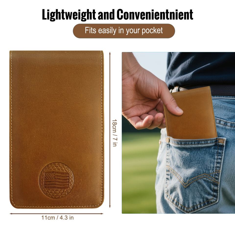 Porta Tarjetas de Puntuación de Golf de Cuero y Microfibra Impermeable de Alta Calidad con Diseño Personalizado Crazy Horse, Juego de Bolígrafos y Libreta de Yardas
