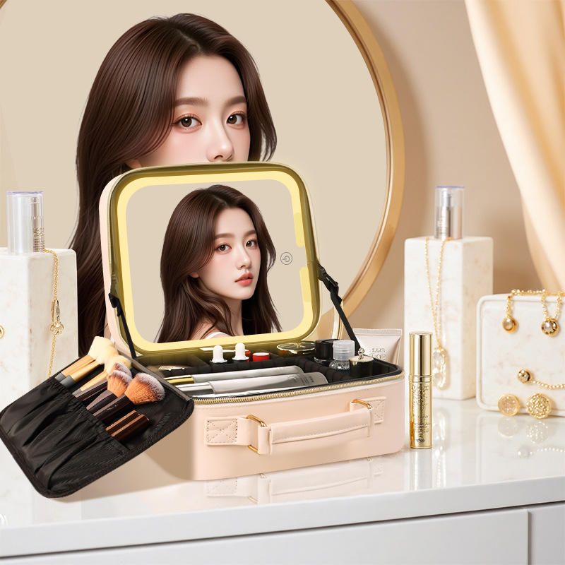 Estuche de maquillaje a cuadros con espejo y luz, organizador de cosméticos de gran capacidad para almacenamiento en el hogar, cierre de cremallera, diseño a cuadros