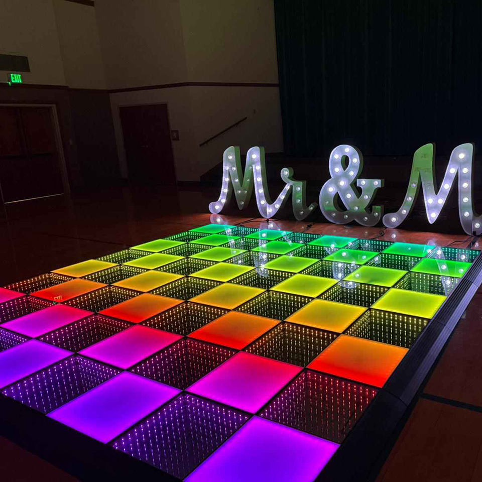 Sistema de control DMX para pista de baile LED con efectos de iluminación personalizables para bodas y eventos profesionales.