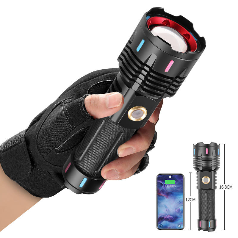 Linterna LED de 30W Recargable con Carga USB, Luz de Alta Intensidad para Exteriores, Modo de Color RGB, Linterna de Largo Alcance