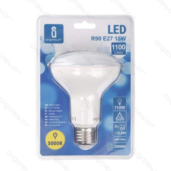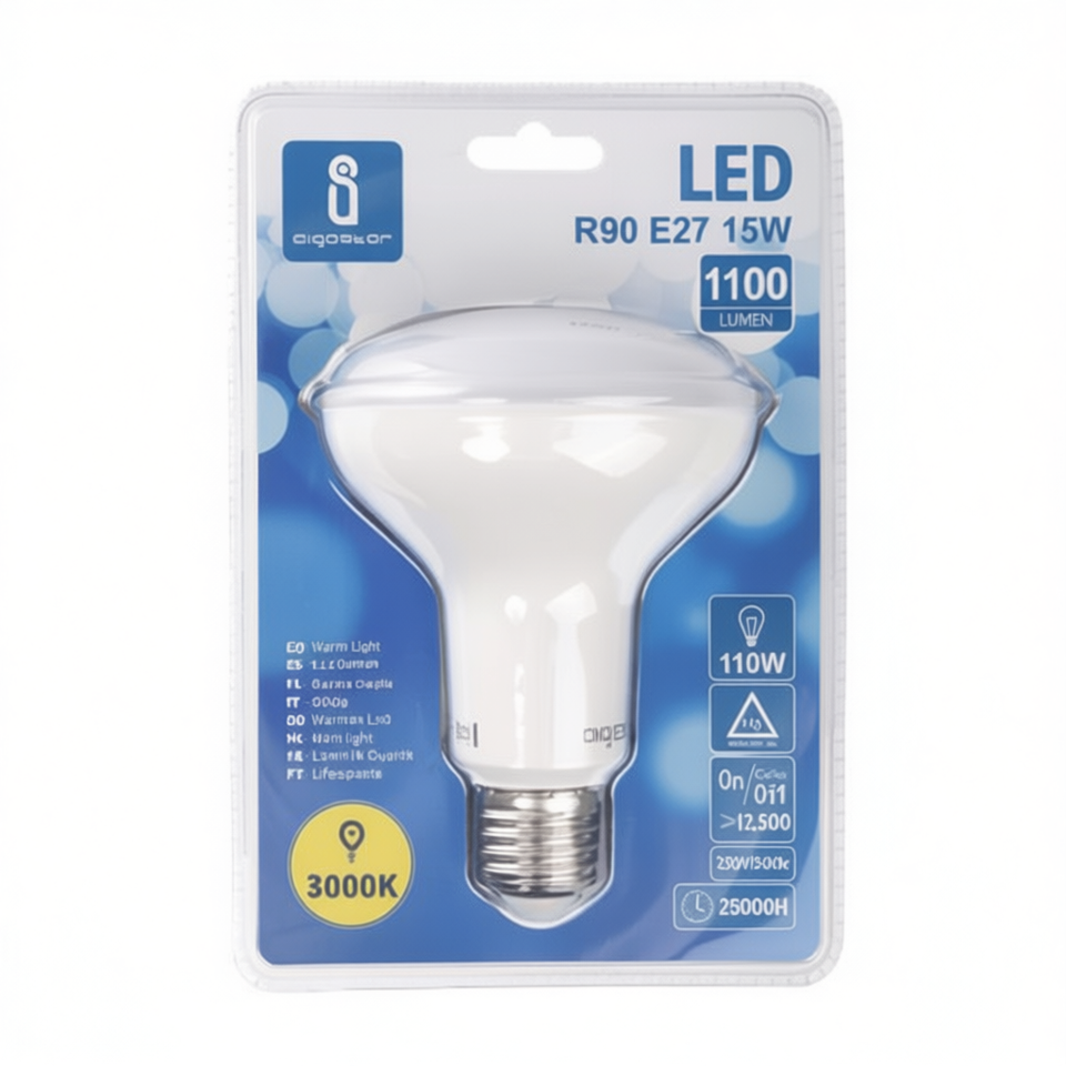 Bombilla LED R90 E27 de 15W, 1100 Lúmenes, Luz Cálida de 3000K, Vida Útil de 25000H
