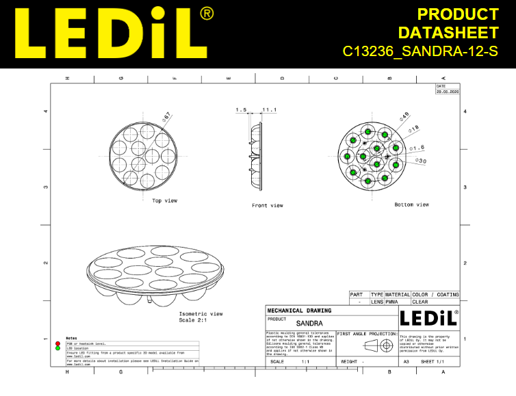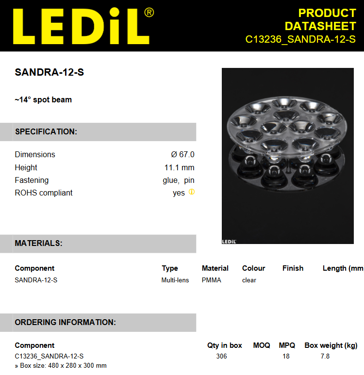 Ledils C13236_SANDRA-12-S Lente LED con soporte integrado Transparente 10 ° ~ 16 ° Adhesivo en Puntos