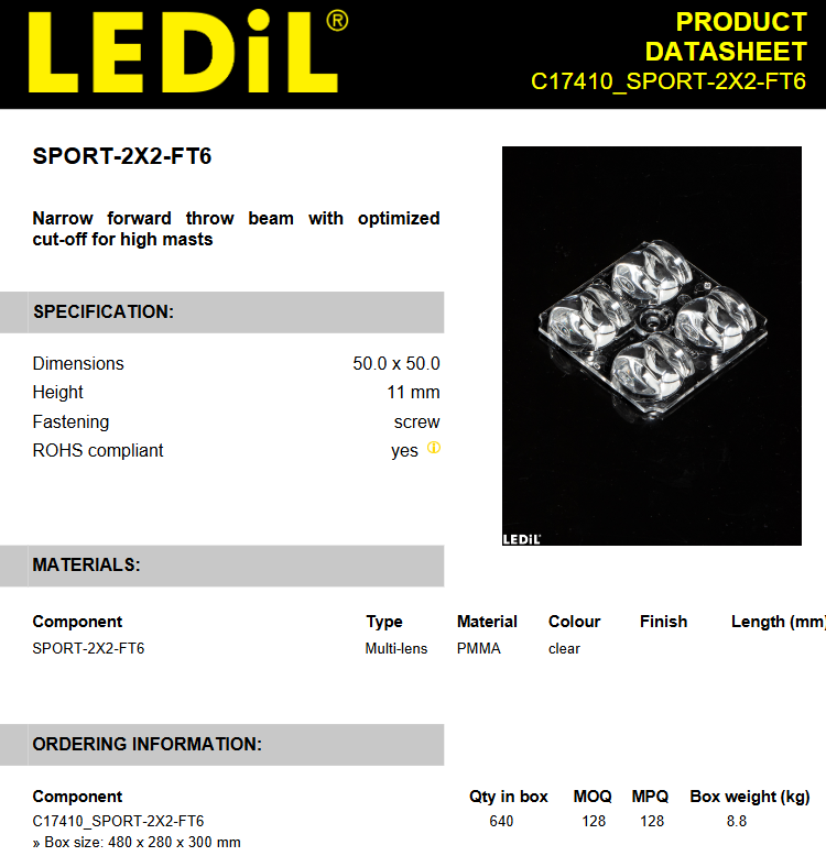 Ledils C17410_SPORT-2X2-FT6 Conjuntos de lentes LED cuadradas de PMMA 50x50mm de haz estrecho y orientación frontal para mástiles altos