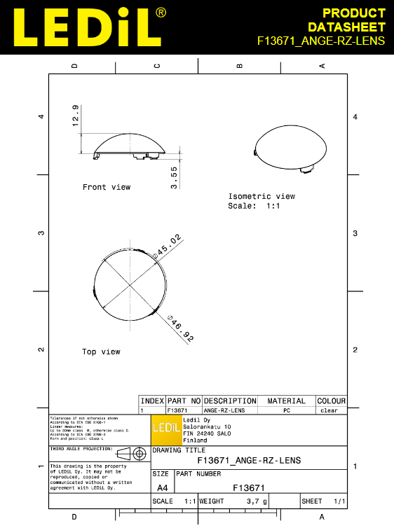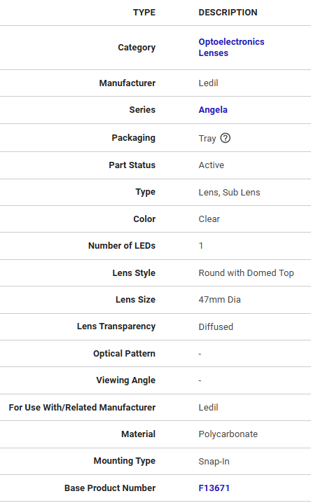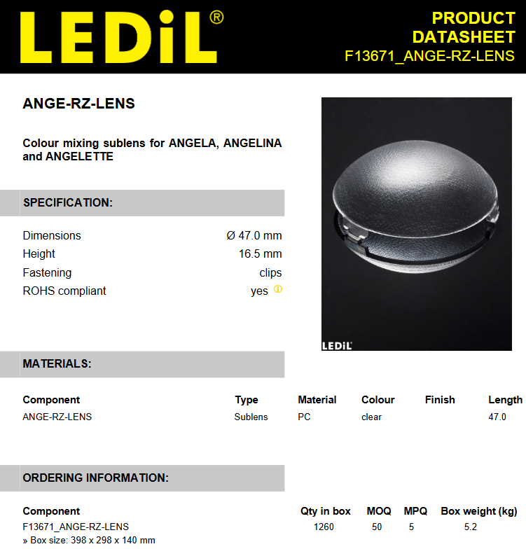 Lentes y Conjuntos LED Ledils F13671_ANGE-RZ-LEN PMMA, Lente Redonda de 47 mm x 16,5 mm, Transparente, Encajable, para Iluminación LED
