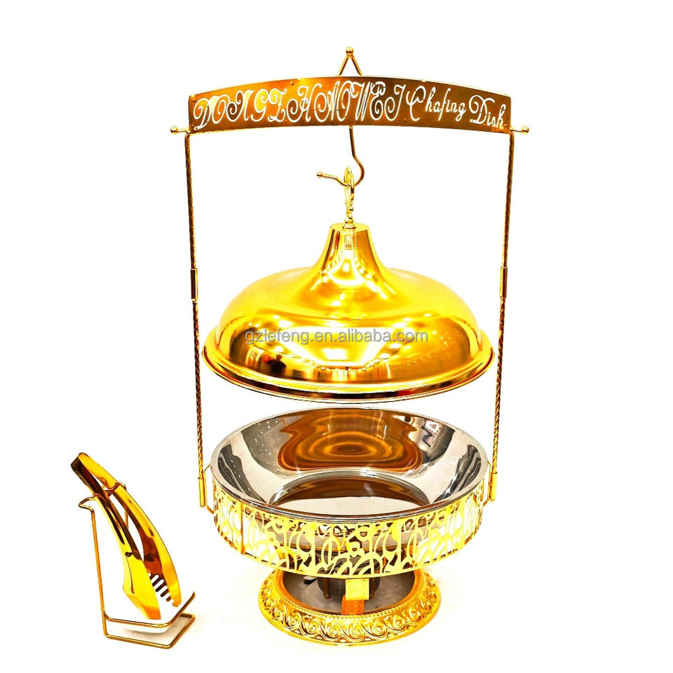 Lefeng Banquet, nuevo diseño, plato de frotamiento único con forma de gloria de la mañana, tapa colgante, juego de Buffet, platos de frotamiento dorados para Catering