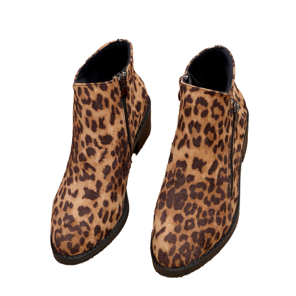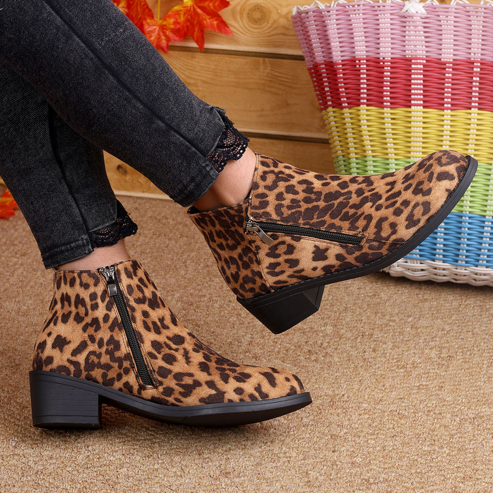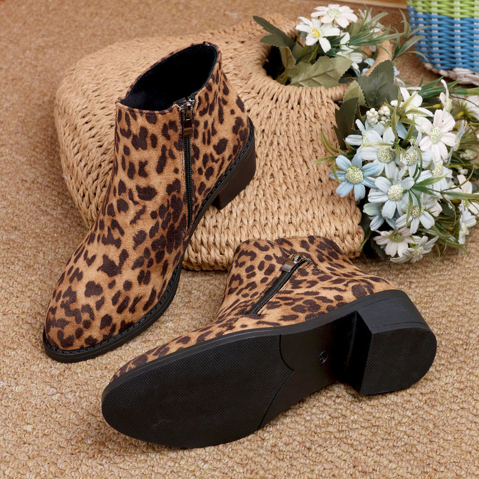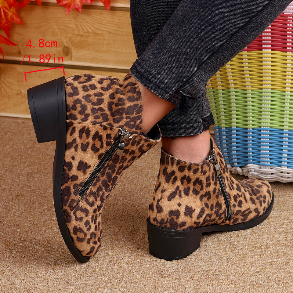 Botines de tacón bajo con efecto leopardo para mujer, botines con cremallera lateral para mujer, botas elegantes a la moda para Otoño e Invierno