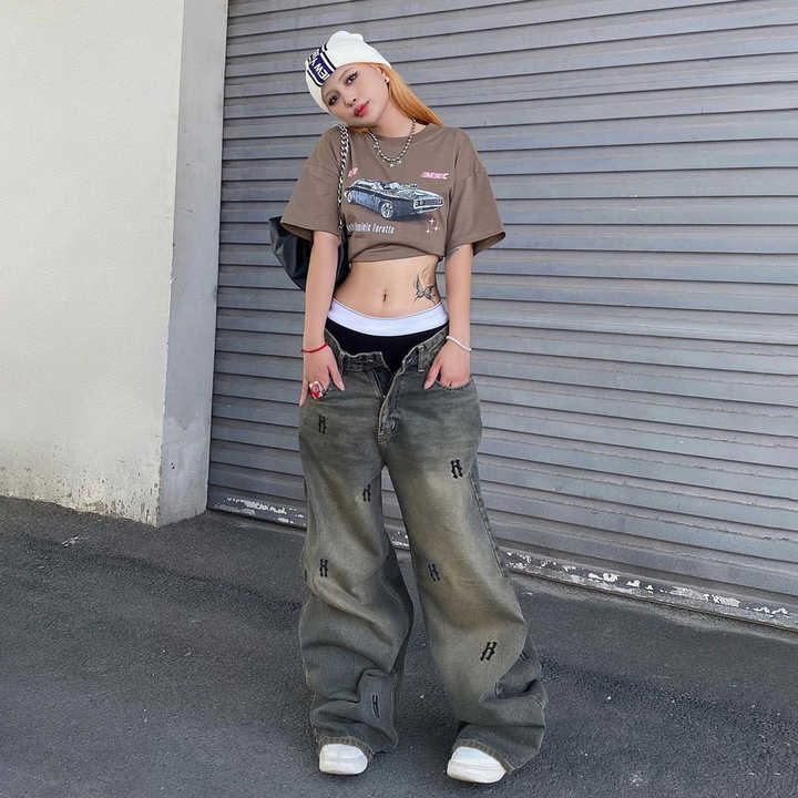 Jeans de Pierna Recta Holgados con Estampado de Letras para Mujer, Estilo Y2K, Casual, Urbano, Desgastado