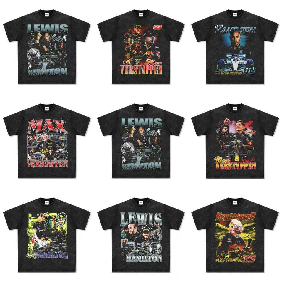 Camiseta de Manga Corta con Estampado del Piloto de F1 Lewis Hamilton, Cuello Redondo, Estilo Urbano Americano, Vintage, Lavada, 230g, Transpirable, 100% Algodón