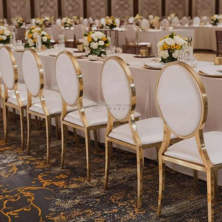 Sillas de comedor de Metal con respaldo de círculo de sol dorado Chapado en plata Lewis para el hogar, Hotel, bodas, banquetes, conferencias, uso en la sala de estar