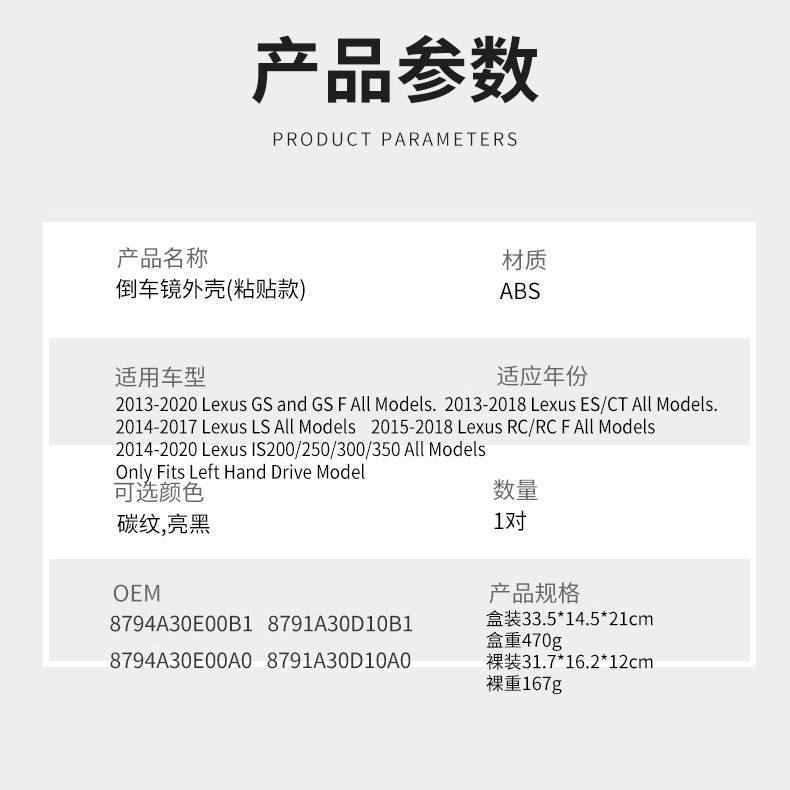 Cubiertas de Espejos Retrovisores de Fibra de Carbono Lexus, Juego Completo, Material ABS Negro Brillante, para IS, LS, GS, RC, ES, CT