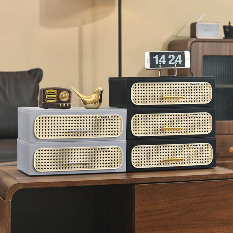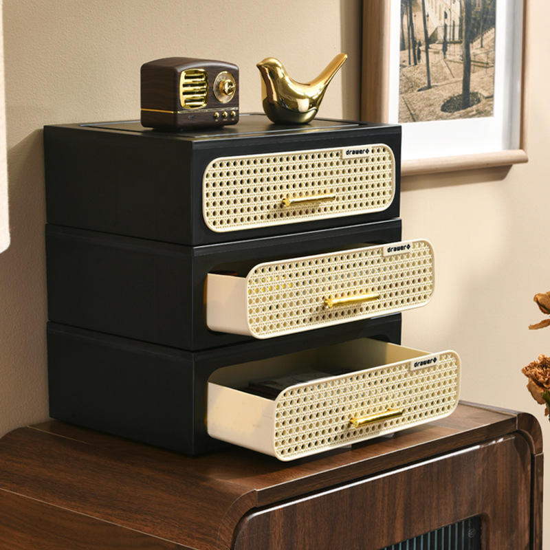 Cajón de ratán tejido de estilo vintage, de una sola capa, negro
