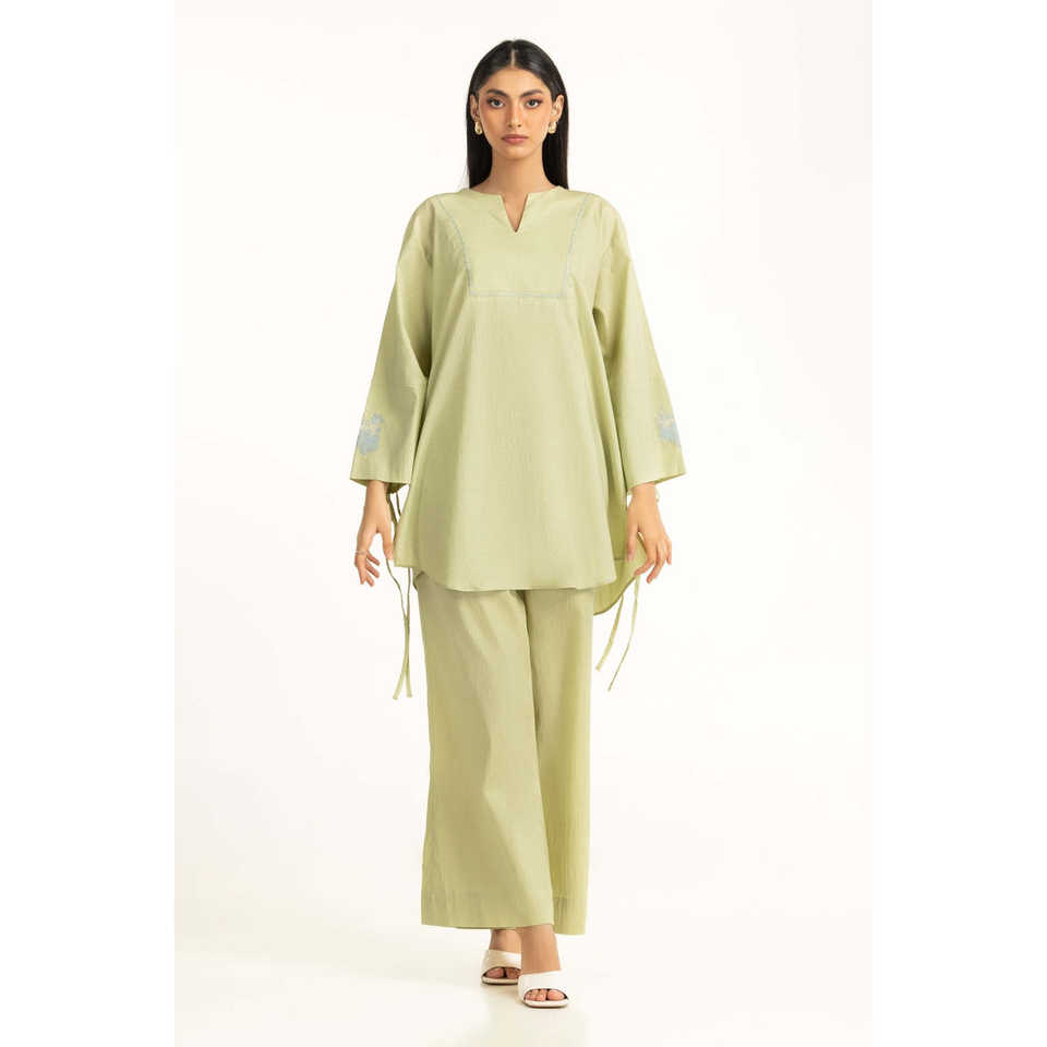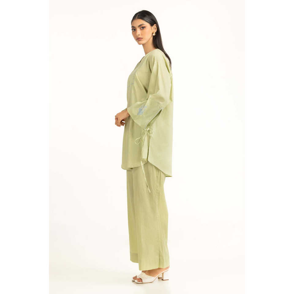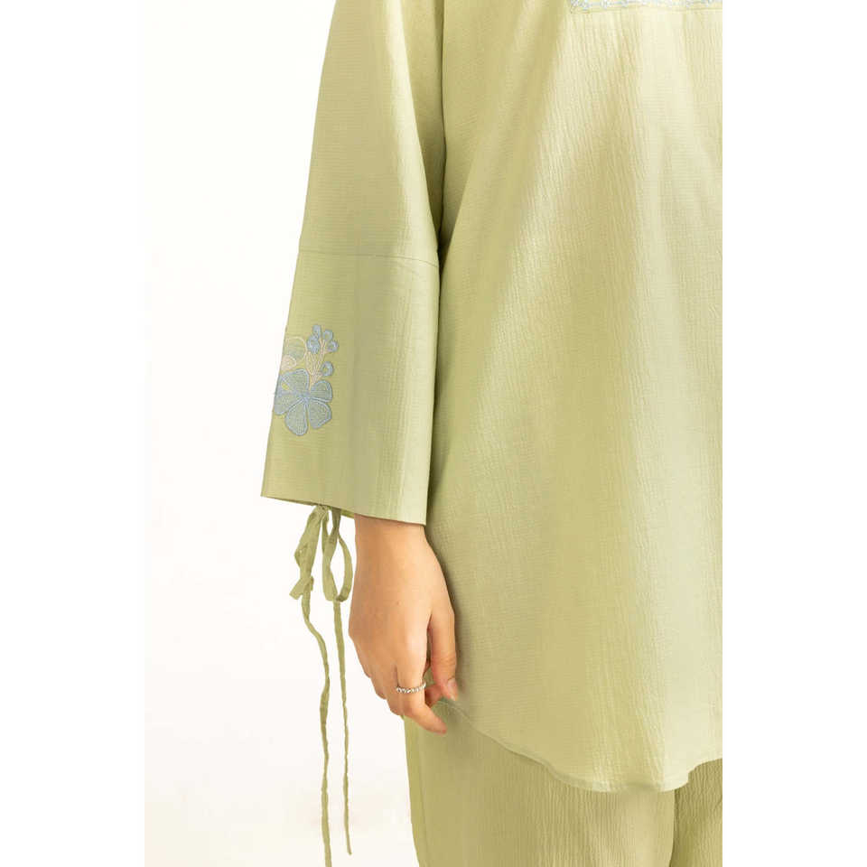 Conjunto de Dos Piezas con Bordado Ondulado Verde Claro, Tela Crepé Informal, Sin Cuello, con Mangas Tres Cuartos para Primavera/Verano