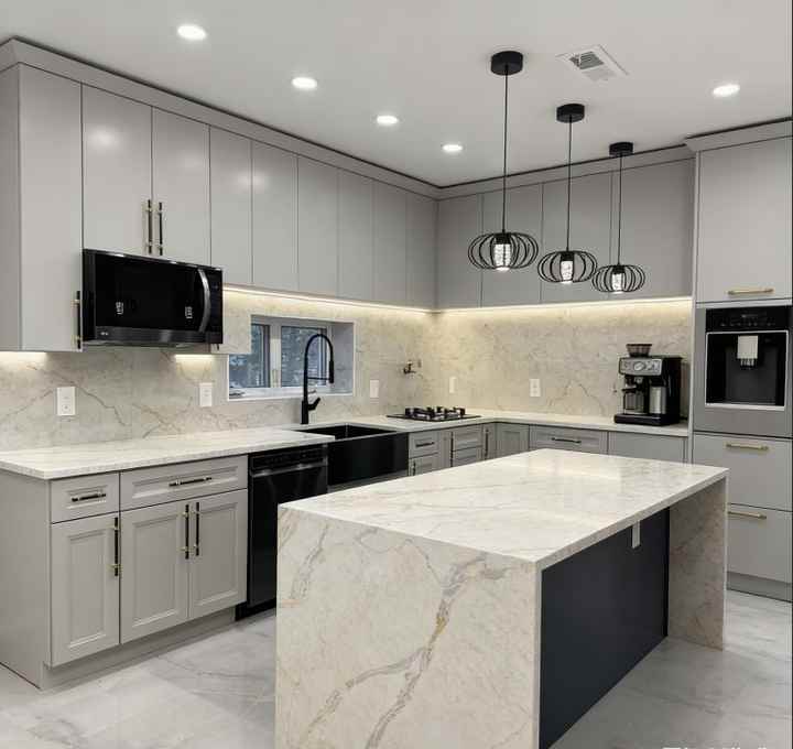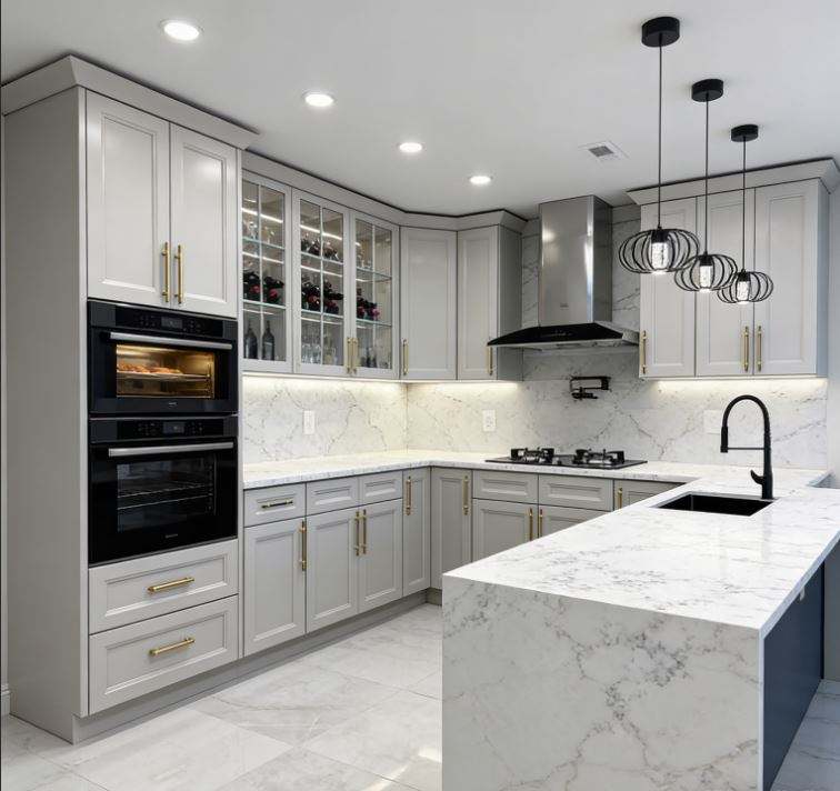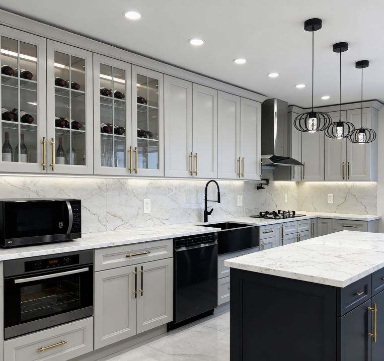 Gabinetes de Cocina de Madera Maciza Gris Claro Listos para Armar con Encimera de Mármol, Isla Central y Microondas Integrado