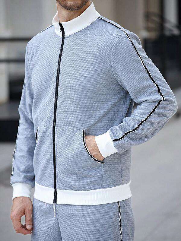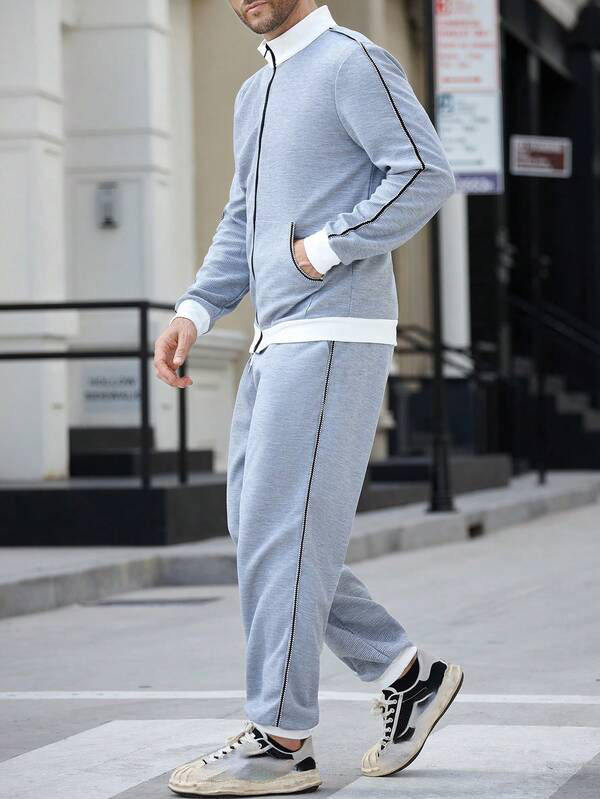 Conjunto Deportivo Informal de 2 Piezas para Mujer, Chaqueta de Manga Larga con Capucha y Cremallera Gris Claro de Invierno, Ribete Blanco en Puños y Dobladillo, Estilo Urbano