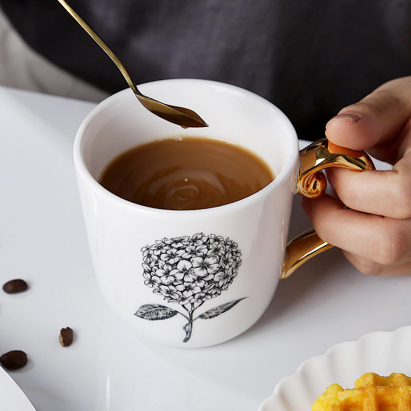 Juego de Tazas de Café de Porcelana Pequeñas de Estilo Europeo de Lujo Ligero, Asa Dorada, Diseño Rústico de Girasol, Apto para Microondas y Lavavajillas