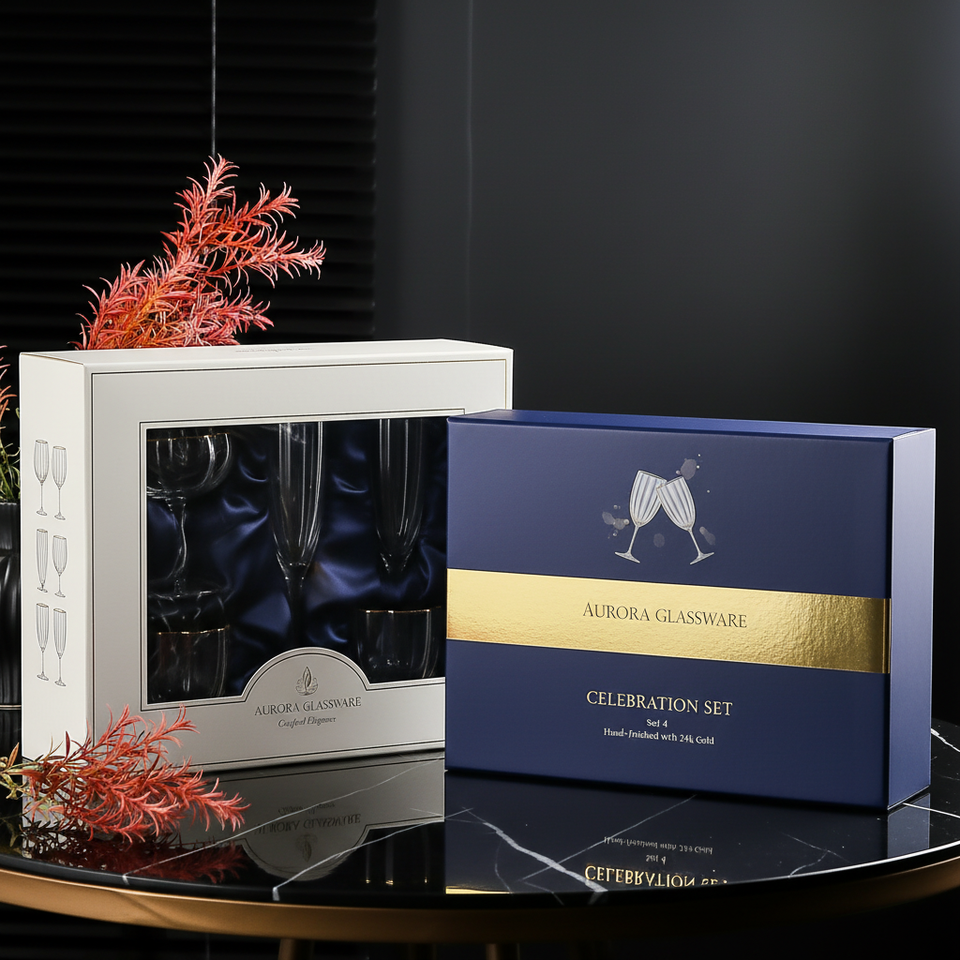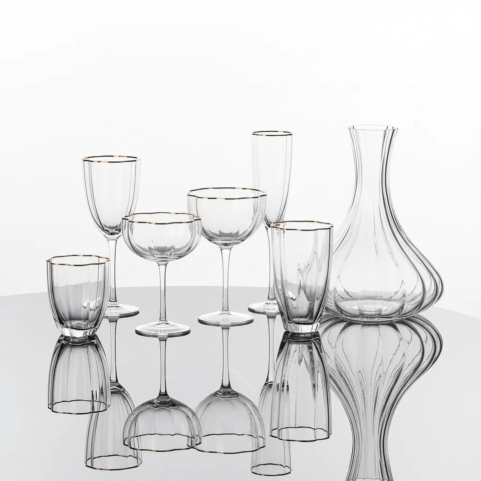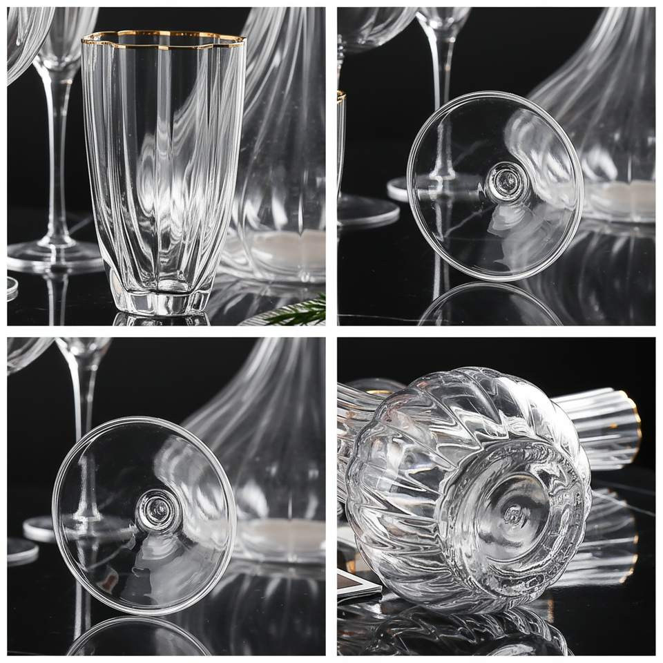 Copas de vino doradas de lujo ligero, transparentes, con relieve dorado y patrón vertical texturizado, para banquetes matutinos.
