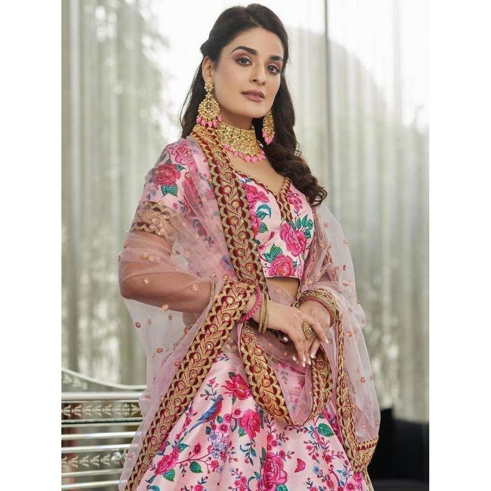Ropa de boda de seda con estampado floral rosa claro Lehenga Choli