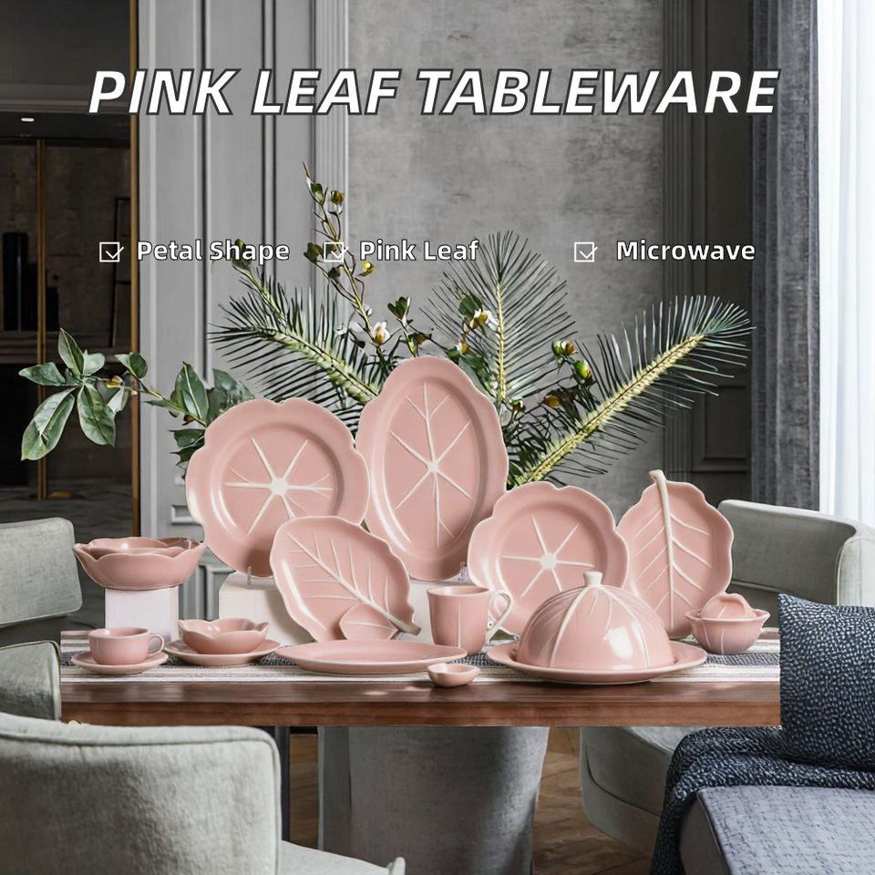 Juego de Vajilla Coreana de Cerámica con Diseño de Hojas Rosa Claro, Plato y Tazón en Forma de Pétalo, Utensilios de Lujo Ligeros para el Hogar, Aptos para Microondas