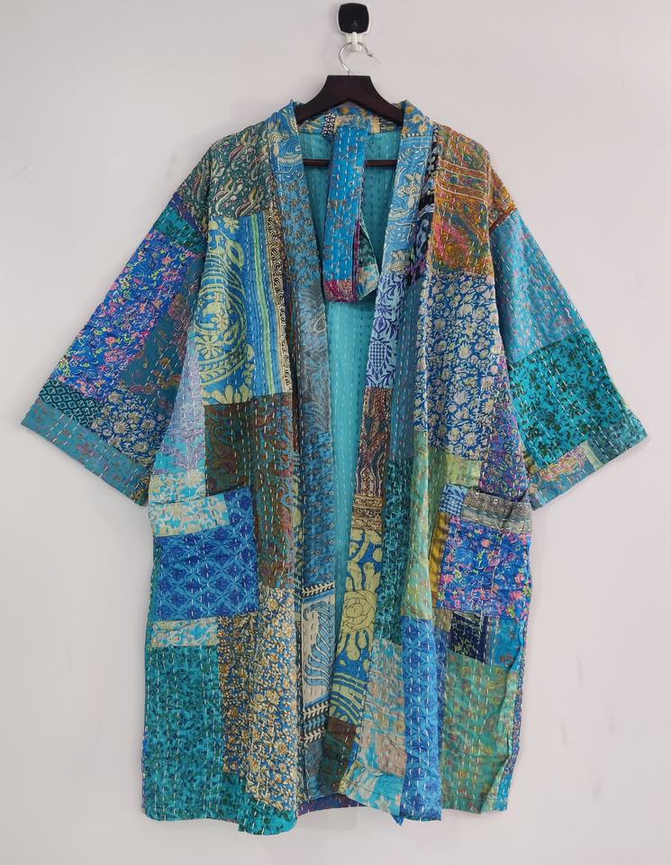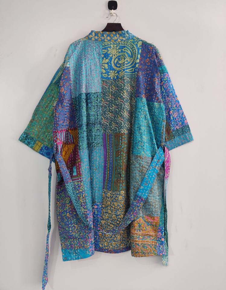 Bata de seda de algodón turquesa ligera para mujer, chaqueta Bohemia Kantha hecha a mano con retazos, cintura Natural lavable