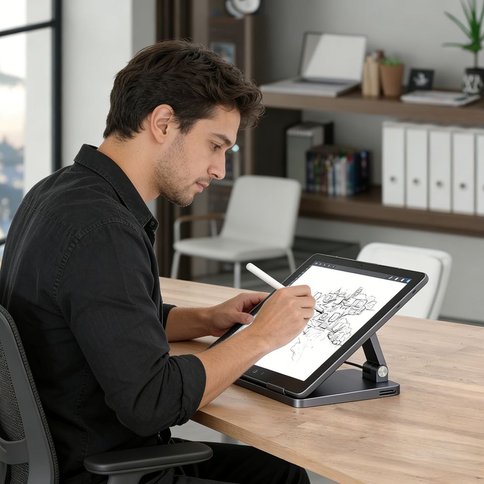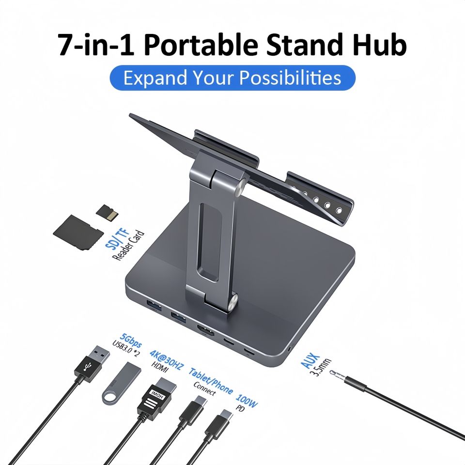 Soporte Ligero para Tablet con Ángulo de Visión Ajustable, Hub de Expansión, Alimentación y Datos, a Precio Competitivo