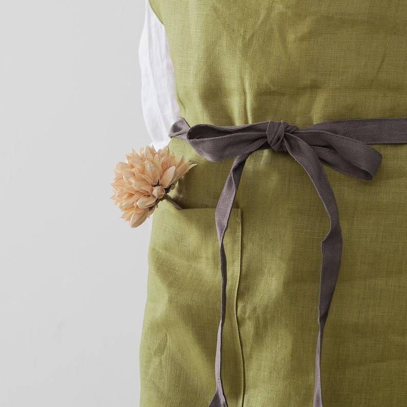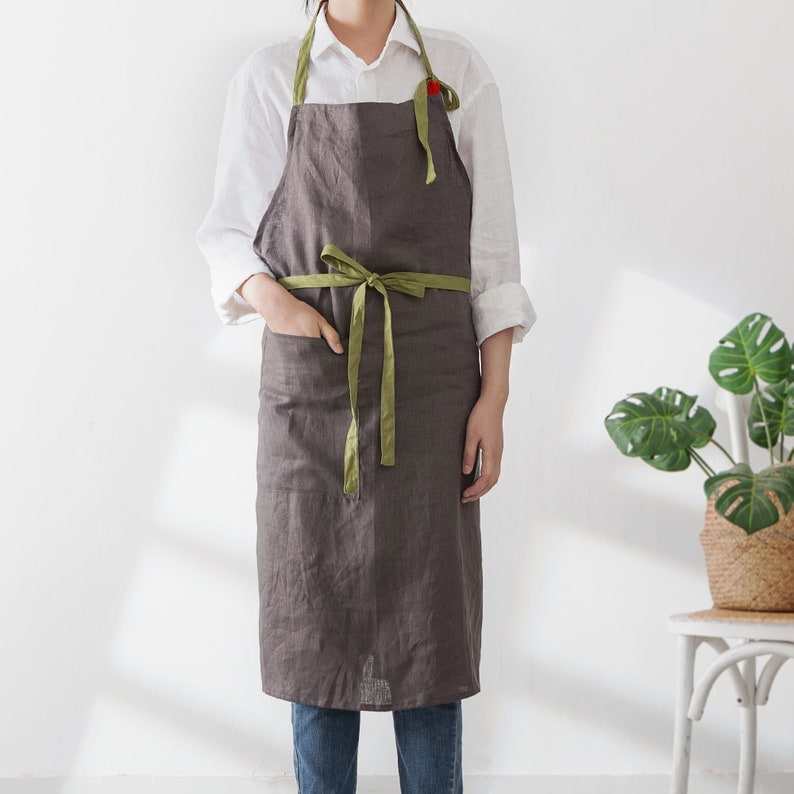 Kit de delantal de lino ligero para mujer, algodón suave con bolsillo profundo para cocinar y jardinería, Lino lavado en la cocina