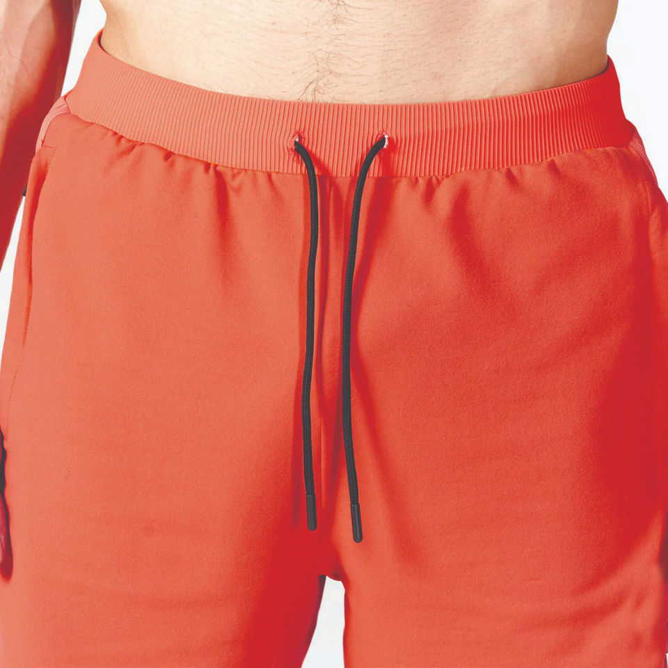 Pantalones cortos flexibles acanalados de tela de rendimiento ligero naranja con cintura de tela acanalada y dobladillo con puños