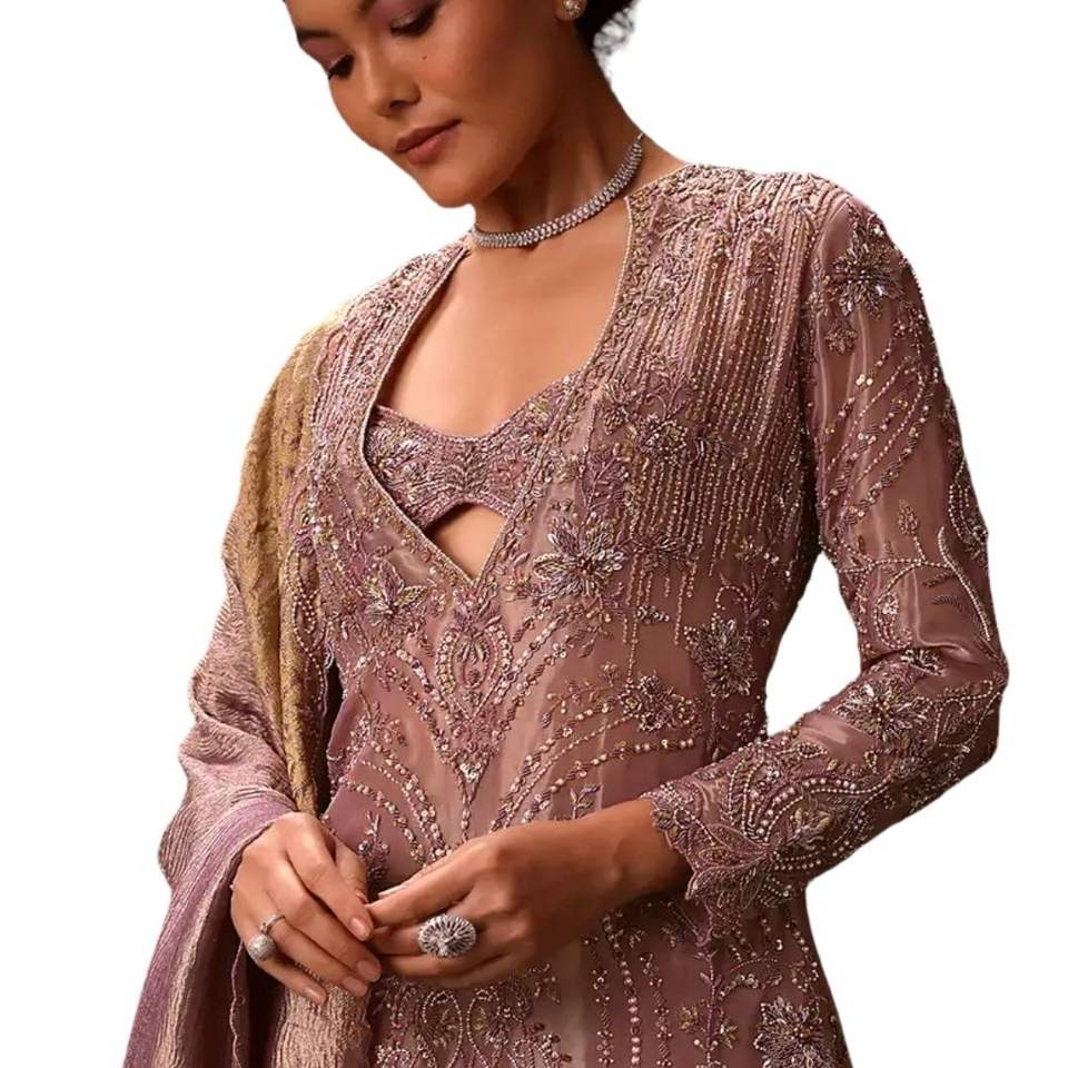 Juego de Kurti Sharara de tejido de platino lila con Dupatta bordado para recepción de boda, ropa nupcial para ocasiones festivas