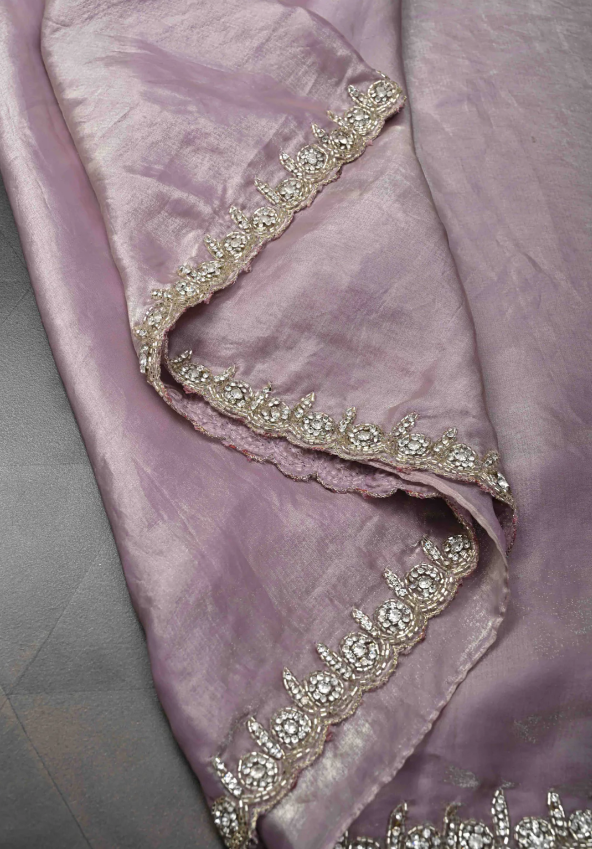 Lila Shimmer Georgette Saree con borde de piedra festoneada con trabajo de tejido con las mismas piezas de blusa de borde