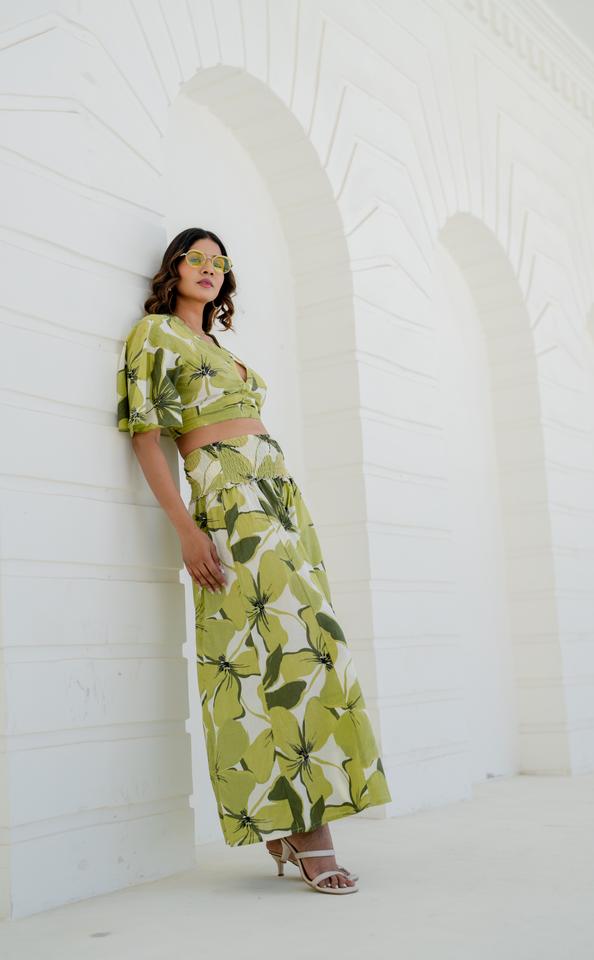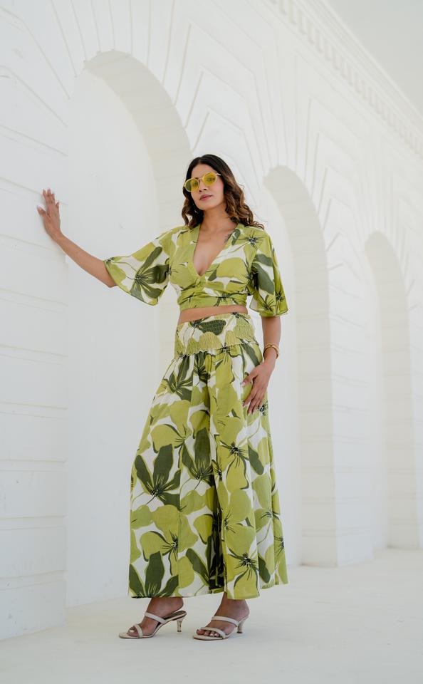 Conjunto de Dos Piezas Verde Lima con Estampado Floral, Top Corto y Pantalones Anchos, Atuendo de Verano, Conjunto Vacacional, Estampado Botánico, Atuendo de Playa Moderno