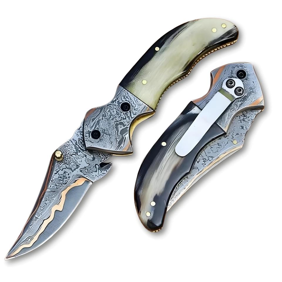 Edición limitada COBRE DAMASCO ACERO Cuchillo de bolsillo Mango de cuerno hecho a mano Cuchillo plegable Regalo único y personalizado